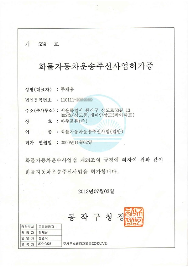 아주물류 주식회사 화물주선사업허가증 입니다.